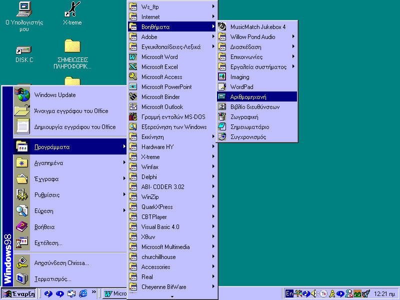 Τοποθετούμε το δείκτη του ποντικιού πάνω στην επιλογή "Προγράμματα". Εμφανίζεται ένα δεύτερο μενού. Σύρουμε το δείκτη του ποντικιού προς τα δεξιά και τον τοποθετούμε πάνω στην επιλογή "Βοηθήματα". Εμφανίζεται ένα τρίτο μενού. Σύρουμε το δείκτη του ποντικιού και τον τοποθετούμε πάνω στην "Αριθμομηχανή" και κάνουμε κλικ