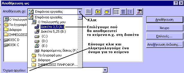 Όταν το κείμενο αποθηκεύεται για πρώτη φορά, εμφανίζεται το παράθυρο "Αποθήκευση ως". Τώρα πρέπει να αποφασίσουμε ΠΟΥ θα το αποθηκεύσουμε και με ΠΟΙΟ όνομα. Αρχικά κάνουμε κλικ στο κουμπί
