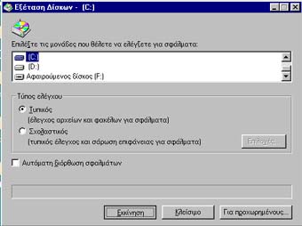Αν, για παράδειγμα, κάνουμε κλικ στο κουμπί "Έλεγχος", θα εμφανιστεί το παράθυρο "Εξέταση δίσκων" και πατώντας το κουμπί "Εκκίνηση" θα γίνει έλεγχος του σκληρού μας δίσκου για σφάλματα. Στο τέλος του ελέγχου, εμφανίζεται στην οθόνη ένα παράθυρο με τα αποτελέσματα του ελέγχου.