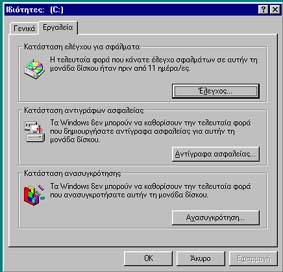 Αν κάνουμε κλικ στη δεύτερη καρτέλα του παραθύρου ("Εργαλεία"), μπορούμε να ελέγξουμε το δίσκο για σφάλματα (πχ. κατεστραμμένες περιοχές) ή να ανασυγκροτήσουμε το δίσκο. Η Ανασυγκρότηση Δίσκων, εκτελείται περιοδικά (πχ. μια-δυο φορές το χρόνο), για να αναδιατάξουμε τη θέση αρχείων και του