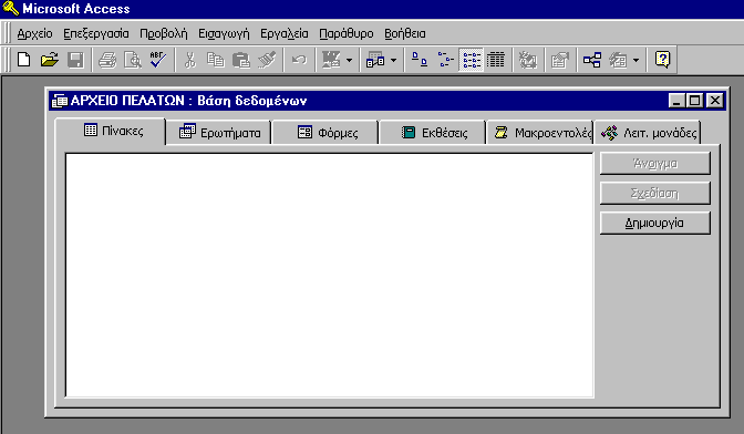 - Προγράμματα - Microsoft Access - Δημιουργία νέας βάσης δεδομένων με χρήση Κενής βάσης δεδομένων - ΟΚΕπιλέγουμε Φάκελο και στο Όνομα αρχείου πληκτρολογούμε ένα όνομα για τη βάση δεδομένων μας. Τέλος κάνουμε κλικ στο κουμπί Δημιουργία. Στην οθόνη εμφανίζεται το Παράθυρο καρτελών που φαίνεται στην Εικόνα 1.
