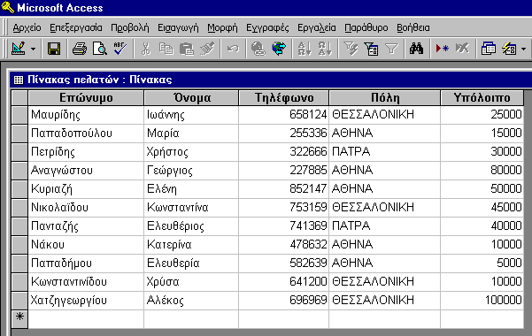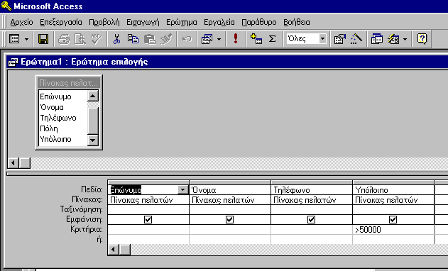 Επιλογή των πεδίων (στηλών) που θα περιέχονται στο ερώτημα: Κάνουμε διπλό κλικ σε κάθε πεδίο του πίνακα που θέλουμε να εμφανίζεται (πχ. Επώνυμο, Όνομα, Υπόλοιπο). Τα πεδία στα οποία κάνουμε διπλό κλικ, εμφανίζονται αυτόματα στο κάτω μέρος του παραθύρου Ερώτημα1. Στη συνέχεια μπορούμε να προσθέσουμε κριτήρια αναζήτησης. Στα κριτήρια μπορούμε να χρησιμοποιήσουμε τα σύμβολα =, >, <, >=, <= και τους λογικούς τελεστές AND (και) και OR(ή). Πχ. αν στα κριτήρια της στήλης Υπόλοιπο πληκτρολογήσουμε >50000 θα εμφανιστούν οι πελάτες με υπόλοιπο μεγαλύτερο των 50000. Αν στα κριτήρια της στήλης Επώνυμο πληκτρολογήσουμε Π* θα εμφανιστούν οι πελάτες που το επώνυμό τους αρχίζει από Π.Στη συνέχεια κάνουμε κλικ στο κουμπί "Προβολή φύλλου δεδομένων" (αριστερά στην οθόνη, κάτω από το Αρχείο) και εμφανίζονται οι εγγραφές και τα πεδία που επιλέξαμε.