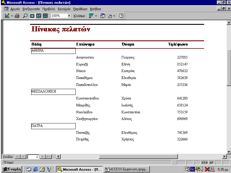 ; Εισάγουμε τα πεδία (στήλες) κάνοντας κλικ σε κάθε ένα απ' αυτά και πατώντας το κουμπί >. Αν θέλουμε να περιλαμβάνονται όλα τα πεδία μπορούμε να πατήσουμε το κουμπί >>. ΕπόμενοΘέλετε να προσθέσετε επίπεδα ομαδοποίησης; Πχ. επιλέγουμε Πόλη και κάνουμε κλικ στο κουμπί >. Επόμενο