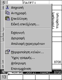 Εισαγωγή νέας γραμμής (ανάμεσα σε δύο άλλες) Κάνουμε δεξί κλικ στον αριθμό της γραμμής, πάνω από την οποία θέλουμε να εισάγουμε τη νέα γραμμή. Από το μενού που εμφανίζεται κάνουμε κλικ στην επιλογή "Εισαγωγή".Διαγραφή γραμμής Κάνουμε δεξί κλικ στον αριθμό της γραμμής που θέλουμε να διαγράψουμε. Από το μενού που εμφανίζεται κάνουμε κλικ στην επιλογή "Διαγραφή". |