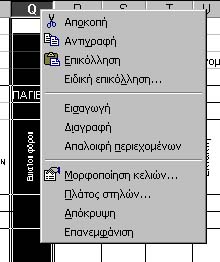 Εισαγωγή νέας στήλης (ανάμεσα σε δύο άλλες) Κάνουμε δεξί κλικ στον αριθμό της γραμμής, αριστερά από την οποία θέλουμε να εισάγουμε τη νέα στήλη. Από το μενού που εμφανίζεται κάνουμε κλικ στην επιλογή "Εισαγωγή".Διαγραφή στήλης Κάνουμε δεξί κλικ στο γράμμα της στήλης που θέλουμε να διαγράψουμε. Από το μενού που εμφανίζεται κάνουμε κλικ στην επιλογή "Διαγραφή". |
