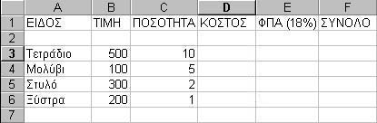 , έχουμε εισάγει τα είδη που αγοράσαμε από ένα βιβλιοπωλείο, την τιμή μονάδας του κάθε είδους και την ποσότητα που αγοράσαμε. Θέλουμε να υπολογίσουμε για κάθε είδος χωριστά, το κόστος (=τιμή μονάδας * ποσότητα), το ΦΠΑ (=κόστος * 18 / 100) και το συνολικό ποσό (=Κόστος + ΦΠΑ).Αρχικά πληκτρολογούμε τα περιεχόμενα των στηλών