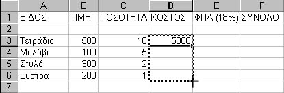 D3. Ο δείκτης του ποντικιού μετατρέπεται σε σταυρό. Πατάμε το αριστερό πλήκτρο του ποντικιού και κρατώντας το πατημένο, σέρνουμε το ποντίκι μέχρι το κελί D6 και αφήνουμε το πλήκτρο. Αυτόματα, συμπληρώνονται τα κελιά D4, D5 και D6 με τους αντίστοιχους τύπους. Το ίδιο μπορούμε να κάνουμε και στις στήλες ΦΠΑ και ΣΥΝΟΛΟ (εισάγοντας τους αντίστοιχους τύπους μόνο για το πρώτο είδος). Τέλος, επιλέγοντας τα κελιά F3, F4, F5 και F6 και πατώντας το κουμπί
