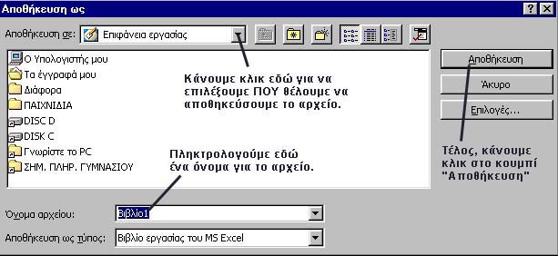 Αποθήκευση βιβλίου: Για να αποθηκεύσουμε το φύλλο, κάνουμε κλικ στο κουμπί