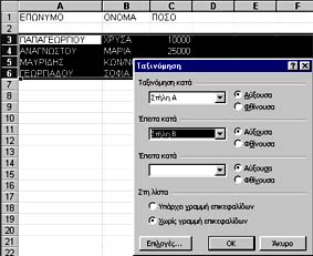 : Ένα λογιστικό φύλλο περιέχει τρεις στήλες: "Επώνυμο", "Όνομα" και "Ποσό σε δρχ.". Κάθε γραμμή του φύλλου είναι και ένας πελάτης της επιχείρησής μας. Θα ταξινομήσουμε τις γραμμές του φύλλου (δηλ. τους πελάτες) σε αλφαβητική σειρά.Επιλέγουμε πρώτα τις γραμμές που θέλουμε να ταξινομήσουμε