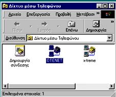 Κάνουμε διπλό κλικ στο εικονίδιο "Ο υπολογιστής μου". Στο παράθυρο που εμφανίζεται, κάνουμε διπλό κλικ στο εικονίδιο "Δίκτυο μέσω τηλεφώνου". Αν έχουν γίνει οι απαραίτητες ρυθμίσεις για τη σύνδεση, μέσα στο νέο παράθυρο που εμφανίζεται, μπορούμε να δούμε το εικονίδιο του παροχέα μας