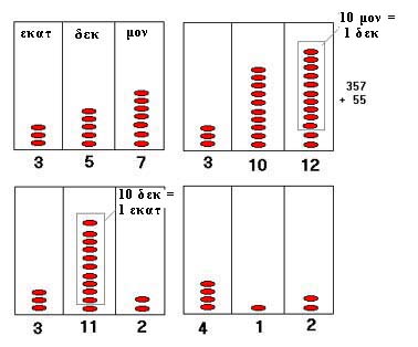 . Επινοήθηκε το 4000 π.Χ. και χρησιμοποιείται ακόμη και σήμερα σε κάποιες χώρες της Ασίας. Αποτελείται από έναν πίνακα χωρισμένο σε στήλες. Η τελευταία δεξιά στήλη προορίζεται για τις μονάδες, η προτελευταία για τις δεκάδες, η προηγούμενη για τις εκατοντάδες κλπ. Σε κάθε στήλη τοποθετούνται ίδια αντικείμενα πχ. χάντρες τα οποία θα ονομάσουμε στοιχεία. Έτσι λοιπόν για να βάλουμε πάνω στον άβακα τον αριθμό 357, θα τοποθετήσουμε 7 στοιχεία στην τελευταία δεξιά στήλη, 5 στοιχεία στην προτελευταία και 3 στοιχεία στην προηγούμενη.Αν τώρα θέλουμε να προσθέσουμε τον αριθμό 55, θα τοποθετήσουμε 5 στοιχεία στην τελευταία στήλη και 5 στοιχεία στην προτελευταία. Έτσι η τελευταία στήλη θα έχει τώρα 12 στοιχεία, η προτελευταία 10 και η προηγούμενη 3. Μαζεύουμε στη συνέχεια 10 στοιχεία της τελευταίας στήλης και βάζουμε 1 στοιχείο στην προτελευταία. Έτσι η τελευταία στήλη θα έχει τώρα 2 στοιχεία
