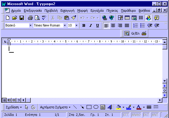 Το πρόγραμμα φορτώνεται στη μνήμη RAM του υπολογιστή μας και εμφανίζεται το παράθυρο του Word. Πατάμε το κουμπί μεγιστοποίησης (αν το παράθυρο δεν γεμίζει όλη την εικόνα) Η λευκή περιοχή της οθόνης, είναι ο χώρος στον οποίο μπορούμε να γράψουμε το κείμενο.