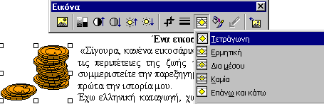 Μόλις εμφανιστεί η εικόνα στην οθόνη, αν δεν εμφανίστηκε ένα μικρό παράθυρο με τίτλο "Εικόνα", κάνουμε δεξί κλικ πάνω στην εικόνα, και από το μενού που εμφανίζεται, κάνουμε κλικ στην επιλογή "Εμφάνιση της γραμμής εργαλείων εικόνας". Μπορούμε, για παράδειγμα, να επιλέξουμε τον τρόπο, με τον οποίο θέλουμε να αναδιπλώνεται το κείμενο γύρω από την εικόνα, κάνοντας κλικ στο κουμπί ![]()