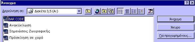 Με παρόμοιο τρόπο όπως στην "Αποθήκευση", διαλέγουμε π.χ. Δισκέτα 3,5 (Α:) Μέσα στο παράθυρο εμφανίζονται τα περιεχόμενα της δισκέτας και κάνουμε κλικ στο όνομα του κειμένου που θέλουμε να ανοίξουμε. Τέλος κάνουμε κλικ στο κουμπί "Άνοιγμα