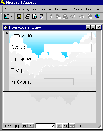 Εμφανίζεται στην οθόνη η 1η εγγραφή του πίνακα. Στο κάτω μέρος του παραθύρου της φόρμας εμφανίζονται τα κουμπιά: