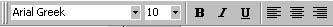 , χρησιμοποιώντας τους καταλόγους γραμματοσειράς (πχ. Arial Greek) και μεγέθους (πχ. 10). Επίσης μπορούμε να μορφοποιήσουμε το περιεχόμενο των επιλεγμένων κελιών με τα κουμπιά Β, Ι και U έτσι ώστε να γίνει πιο έντονο, πλάγιο ή υπογραμμισμένο αντίστοιχα. Τέλος, μπορούμε με τα τρία τελευταία κουμπιά της παραπάνω εικόνας να στοιχίσουμε το περιεχόμενο των επιλεγμένων κελιών αριστερά, κέντρο ή δεξιά.