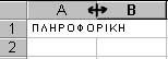 , τοποθετούμε το δείκτη του ποντικιού ανάμεσα στο γράμμα της στήλης που θέλουμε να αλλάξουμε το πλάτος της και στο γράμμα της επόμενης στήλης, πατάμε το αριστερό πλήκτρο του ποντικιού και κρατώντας το πατημένο, σέρνουμε το ποντίκι μέχρι το σημείο που θέλουμε. Στην εικόνα θα αλλάξει το πλάτος της στήλης Α.