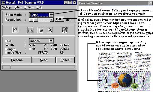 Scan Mode (Color ή Gray για έγχρωμη ή με αποχρώσεις του γκρι σάρωση αντίστοιχα) και στο πλαίσιο Resolution σέρνουμε το δεξί-αριστερό βελάκι ή πληκτρολογούμε έναν αριθμό, ο οποίος αντιπροσωπεύει τις τελίτσες ανά ίντσα (dots per inch) της ψηφιακής εικόνας. Όσο πιο μεγάλος είναι αυτός ο αριθμός, τόσο πιο καλή θα είναι η ψηφιακή εικόνα, αλλά θα καταλάβει στο σκληρό δίσκο περισσότερο χώρο. Στο δεξί παράθυρο (Preview Window), σέρνουμε τις 4 πλευρές του διακεκομμένου ορθογωνίου έτσι ώστε να μπει μέσα στο ορθογώνιο, το τμήμα της σελίδας που θέλουμε να εισάγουμε στον υπολογιστή. Στο παραπάνω παράδειγμα, θα εισάγουμε στον υπολογιστή την εικόνα της σελίδας (αυτή που απεικονίζει πως ανταλλάσσουν πληροφορίες δύο υπολογιστές μέσω Internet).Στη συνέχεια, κάνουμε κλικ στο κουμπί
