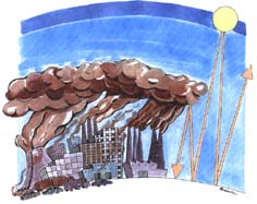Η ατμόσφαιρα της Γης είναι σαν ένα θερμοκήπιο που αφήνει τις ακτίνες του ήλιου να περάσουν αλλά δεν αφήνει όλη τη θερμότητα να διαφύγει. ¨Ετσι δημιουργήθηκε η ζωή πάνω στον πλανήτη μας. Τον τελευταίο κυρίως αιώνα, η παραγωγή μεγάλων ποσοτήτων διοξειδίου του άνθρακα (CO 2) και χλωροφθορανθράκων (CFC) είναι οι κύριες αιτίες της αύξησης της θερμοκρασίας της Γης, γιατί συγκρατούν περισσότερη ποσότητα θερμότητας απ' ότι θα έπρεπε. Έτσι η Γη μας απειλείται με υπερθέρμανση. |